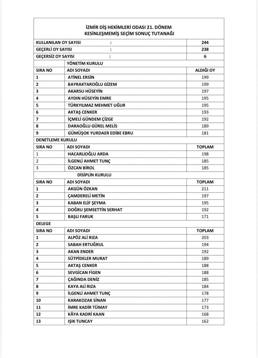 Odamızın 21. Olağan Genel Kurulu kapsamında 12.4.2026 tarihinde gerçekleştirilen seçimlerin kesin olmayan sonuçları aşağıda yer almaktadır. Kesin sonuçlar açıklandığında buradan meslektaşlarımızla paylaşacağız.